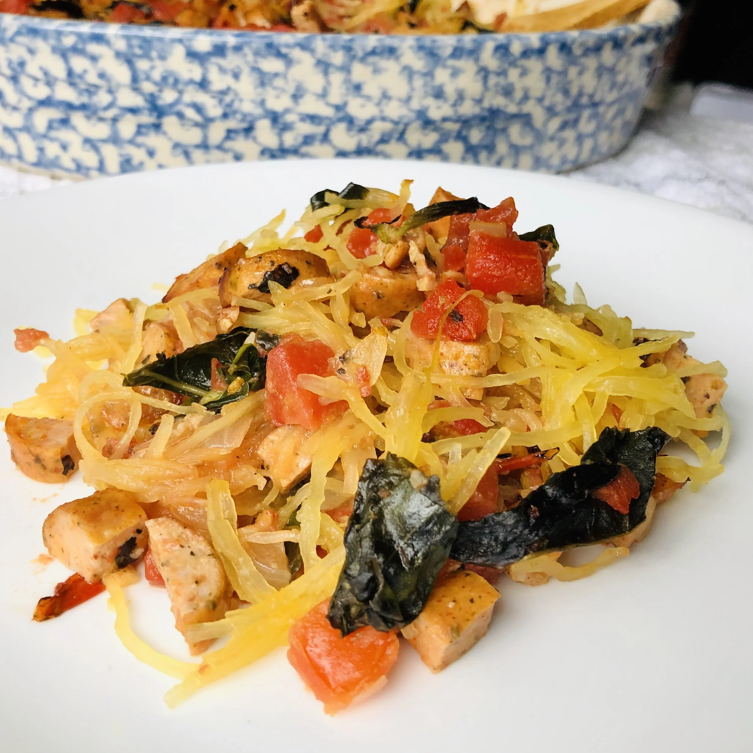 In a large casserole dish, layer the spaghetti with the sausage mixture to evenly mix. Bake for 15-20 minutes or until heated through.